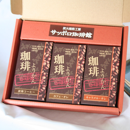 当館の炭火焙煎コーヒーを使用した羊かんです。 炭焼きコーヒー・カフェオレ・キャラメル・オレ味 各1本セットの計3本セット。