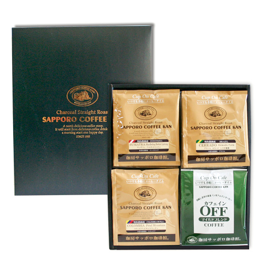 当館こだわりの契約農園産3種とカフェインレスコーヒーをセットしたバラエティ豊かなドリップコーヒーギフト。 カップに乗せてお湯を注ぐだけで簡単にお飲みいただけるカップオンタイプです。